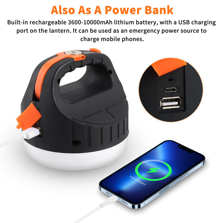 USB Rechargeable camping lanterns built-in 3600mAh rechargeable battery operated (high quality USB cable included, Cable Length: 0.5M), with a 5V charging USB port, charge your phones, iPad conveniently when needed. Support 5V DC charger adapter (not included).