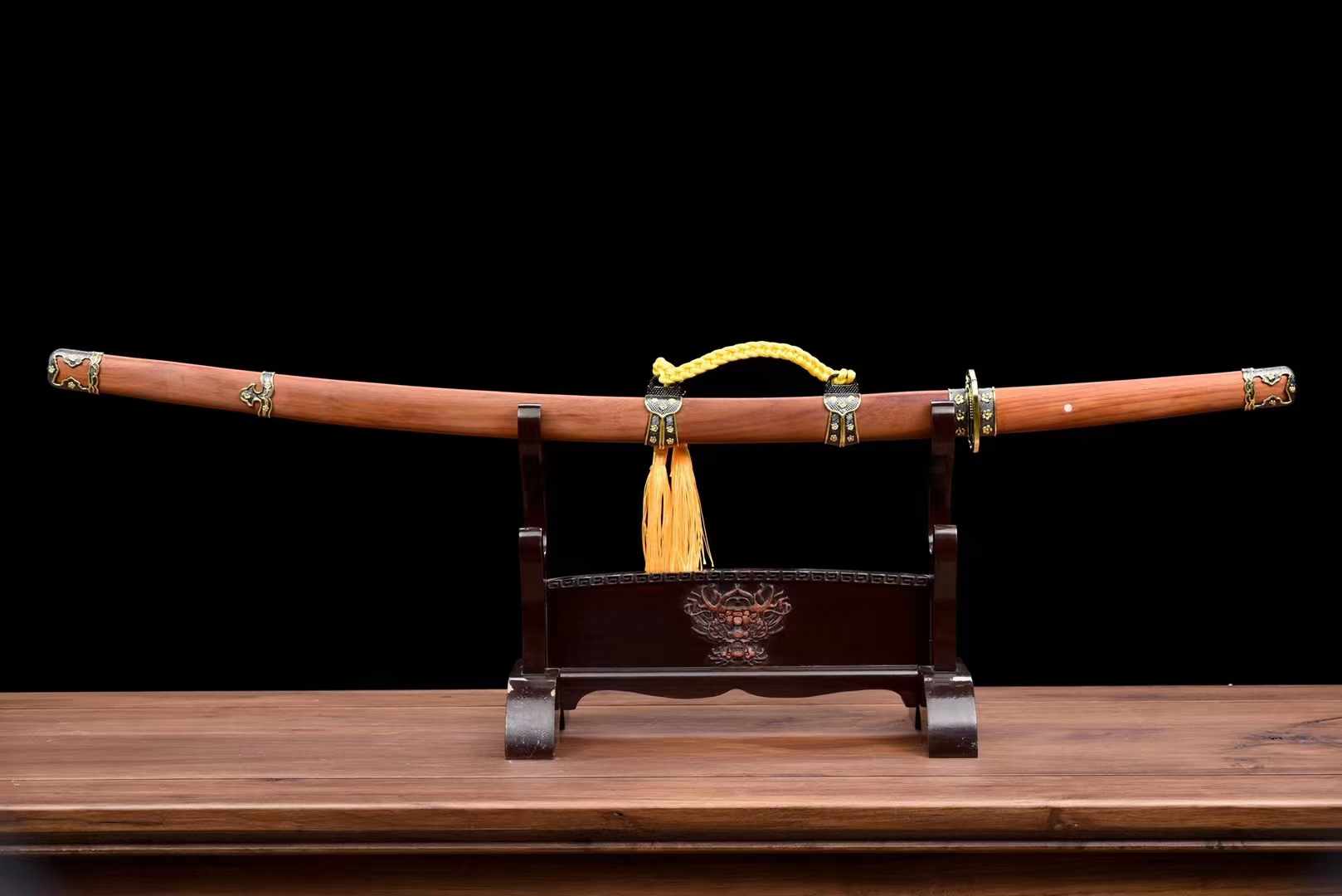 The 72cm blade, with a width ranging from 3.2 to 2.8cm and a thickness of 0.7cm, is balanced by the 26.5cm handle. The overall length of 104cm, including the imported rosewood scabbard and alloy fittings, creates an impressive and visually striking package.